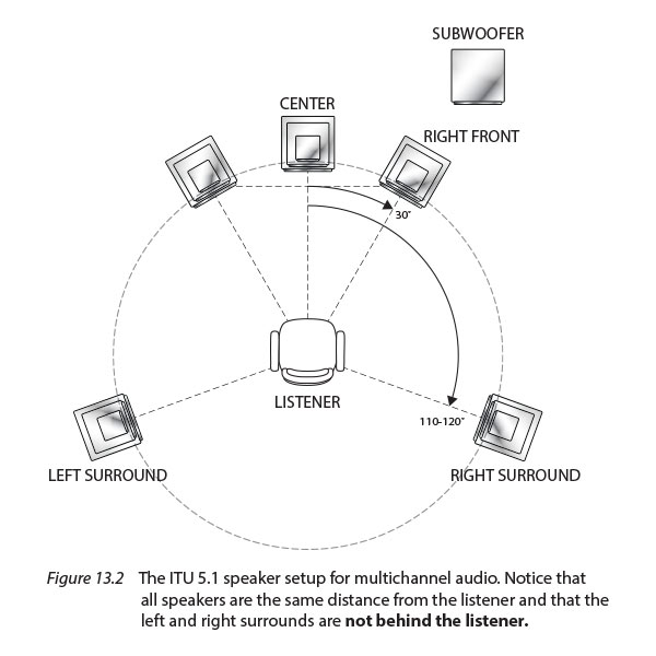 I know this is sometimes hard to accomplish in your living room or home theater…but it is the ideal. You’ll get the best sound if you have 5 identical speakers arranged in a circle outputting the sound directly towards you. The left and right front speakers form an equilateral triangle with the listener’s central position. The center front speaker is at the 0 degree position along the circle position and the left and right surround speakers are located between 110-120 degrees from the center line on either side. That’s how it is in my studio and that’s how you should position your setup…if possible.